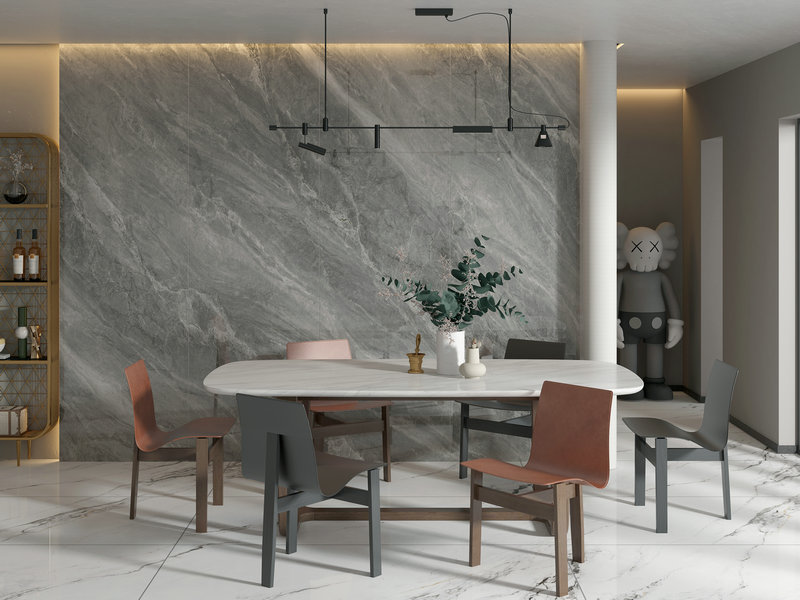 以灰色為主色調,白色的石紋如同浪花一般浮現表面,層次分明,精致細膩的紋理彰顯著產品的藝術表現力。